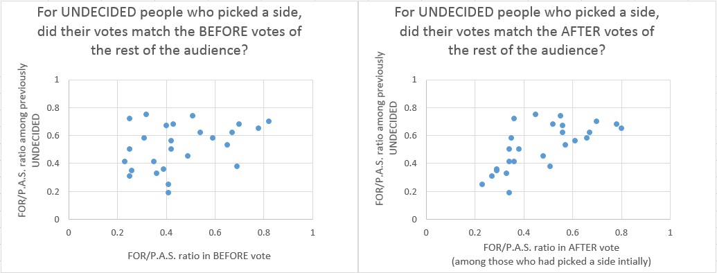 - The AFTER votes of the rest of the audience (FOR/P.A.S. in AFTER vote, among those who had picked a side initially). Based on the debate, maybe a certain percentage will vote FOR regardless of whether they were UNDECIDED to start with.